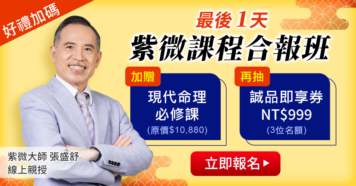 線上課程 全系列紫微線上課程(入門+應用+專業班) 張盛舒 老師 124小時 收錄紫微入門班、應用班、專業班完整課程,三階段由淺入深,不需慧根、不用先修,上完課就能實戰解盤。 了解更多 線上課程 紫微入門班 張盛舒 老師 14小時 輕鬆入門好上手,只要14堂課,就能看懂自己命盤,初學者必備! 了解更多 線上課程 紫微應用班 張盛舒 老師 20小時 集結紫微現代解析的精華,讓命理真正活用於生活中,最高級的人際應用。 了解更多 線上課程 紫微專業班 張盛舒 老師 90小時 收錄最完整解盤演練,培養論命解題的實戰技能,傳授命理師需具備的專業知識,命理生涯必學的一門課。 了解更多 線上課程 紫微解盤實戰班 張盛舒 老師 20小時 張盛舒老師首度公開解盤心法,全面升級你的解盤實戰力,幫你從「看得懂」命盤走向「說得清處」命盤。 了解更多 線上課程 紫微線上課程4班合報(入門+應用+專業+解盤班) 張盛舒 老師 144小時 收錄紫微入門班、應用班、專業班、以及最新的解盤班,給你最完整的四階段紫微學習系統。 了解更多 上一頁 下一頁