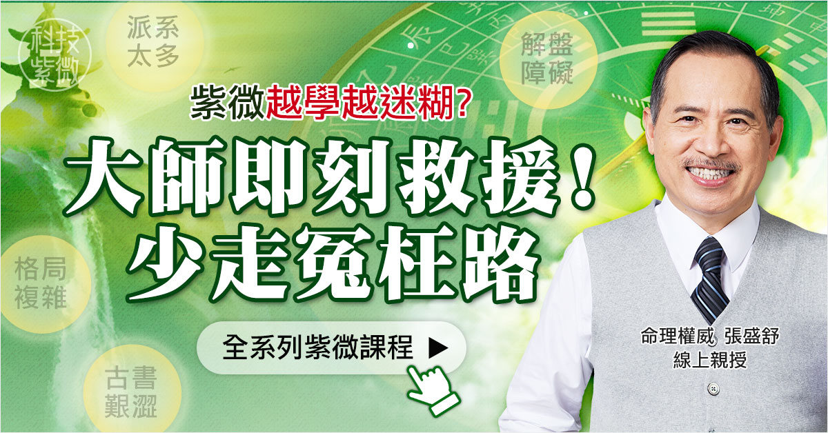 線上課程 紫微解盤直播班(開課中) 張盛舒 老師 20小時 張盛舒老師首度公開解盤心法,全面升級你的解盤實戰力,幫你從「看得懂」命盤走向「說得清處」命盤。 了解更多 線上課程 紫微線上課程4班合報(入門+應用+專業+解盤班) 張盛舒 老師 144小時 收錄紫微入門班、應用班、專業班、以及最新的解盤班,給你最完整的四階段紫微學習系統。 了解更多 線上課程 全系列紫微線上課程(入門+應用+專業班) 張盛舒 老師 124小時 收錄紫微入門班、應用班、專業班完整課程,三階段由淺入深,不需慧根、不用先修,上完課就能實戰解盤。 了解更多 線上課程 紫微入門班 張盛舒 老師 14小時 輕鬆入門好上手,只要14堂課,就能看懂自己命盤,初學者必備! 了解更多 線上課程 紫微應用班 張盛舒 老師 20小時 集結紫微現代解析的精華,讓命理真正活用於生活中,最高級的人際應用。 了解更多 線上課程 紫微專業班 張盛舒 老師 90小時 收錄最完整解盤演練,培養論命解題的實戰技能,傳授命理師需具備的專業知識,命理生涯必學的一門課。 了解更多 上一頁 下一頁