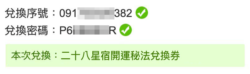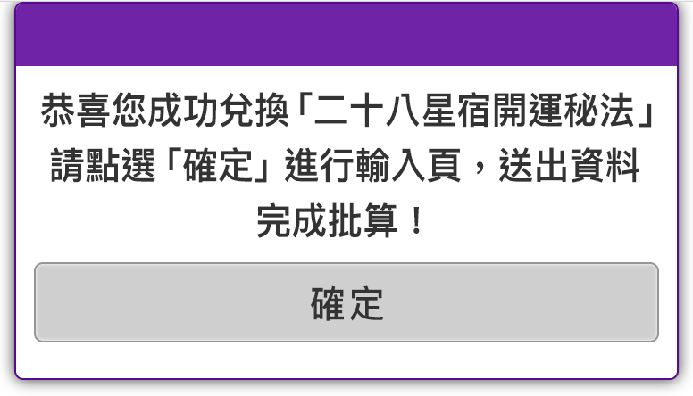 歡迎使用兌換專區,請先填寫相關資料,再依照指示操作喔!※查看兌換流程 請輸入以下資料 x x x 請輸入驗證碼 驗證碼錯誤 看不清楚?點此處取得新數字 確認送出 兌換操作流程 依序輸入兌換序號、密碼、驗證碼 確認兌換資料正確,即可登入進行兌換流程(以下資訊為範例說明) ※已登入會員者可直接進行兌換 兌換成功後,可至優惠點券列表查看本次兌換贈品(以下資訊為範例說明) 兌換說明 在進行序號兌換前,請先登入科技紫微網會員,若非會員者請先加入會員再進行兌換流程。 同一組序號僅可使用一次。 兌換之贈品將匯入您所登入帳號中,登入會員於「優惠點券列表」即可查詢兌換贈品。 兌換之贈品不得折換成現金。 必須遵守主辦單位的使用規範及其他有關之規定,如有違反,即自動取消會員資格。 兌換序號時填寫或提出之資料均為真實且正確,且未冒用或盜用任何第三人之資料或侵害他人之智慧財產權。如有不實或不正確之情事,將被取消參加會員資格;且如有致損害於主辦單位或其他任何第三人,應負一切民刑事責任。
